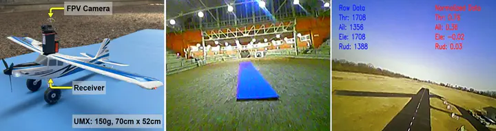 Our 150g fixed-wing can autonomusly land using only vision, without IMU or motion capture.We present FalconWing – an open-source, ultra-lightweight (150 g) fixed-wing platform for autonomy research. The hardware platform integrates a small camera, a standard airframe, offboard computation, and radio communication for manual overrides. We demonstrate FalconWing’s capabilities by developing and deploying a purely vision-based control policy for autonomous landing (without IMU or motion capture) using a novel real-to-sim-to-real learning approach. Our learning approach (1) constructs a photorealistic simulation environment via 3D Gaussian splatting trained on real-world images; (2) identifies nonlinear dynamics from vision-estimated real-flight data; and (3) trains a multi-modal Vision Transformer (ViT) policy through simulation-only imitation learning. The ViT architecture fuses single RGB image with the history of control actions via self-attention, preserving temporal context while maintaining real-time 20 Hz inference. When deployed zero-shot on the hardware platform, this policy achieves an 80% success rate in vision-based autonomous landings. Together with the hardware specifications, we also open-source the system dynamics, the software for photorealistic simulator and the learning approach.